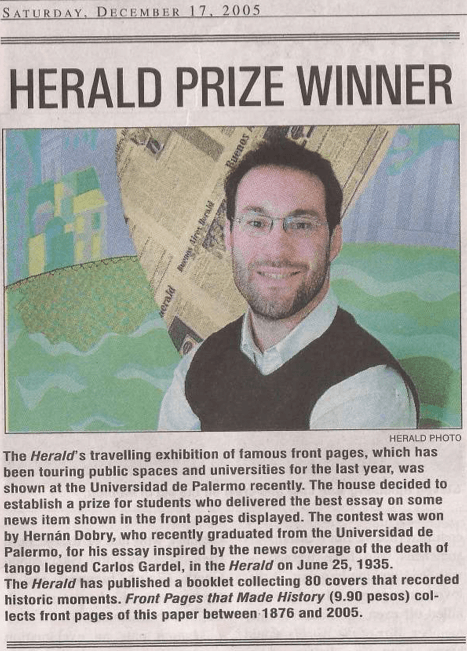 The contest was won by Hernáb Dobry, who recently graduated from the Universidad de Palermo, for his essay inspored by the news coverage of the death of tango legend Carlos Gardel, in the Herald on June 25, 1935.
