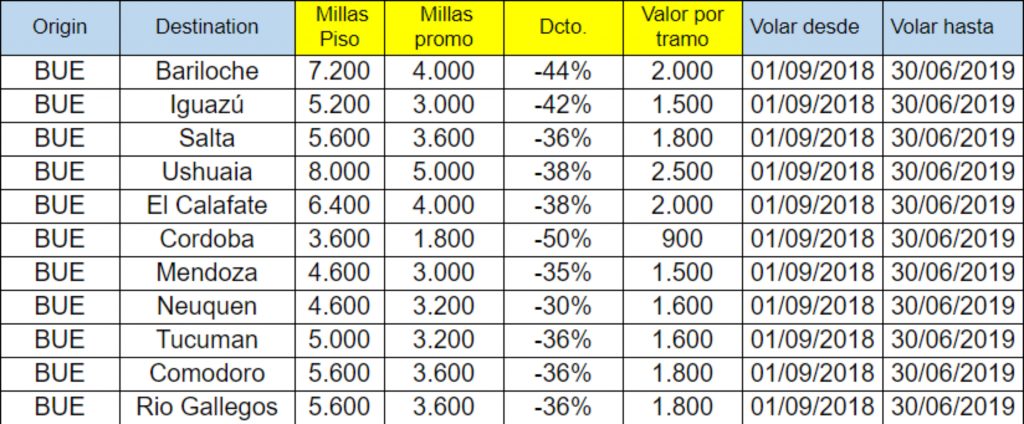 Siguiendo el ejemplo de un viaje a la ciudad de Córdoba desde Buenos Aires, se precisará un total de 1.800 millas LATAM Pass para volar entre el 1 de septiembre y el 30 de junio de 2019, cuando eran necesarias 3.600, lo que implica una reducción del 50%.