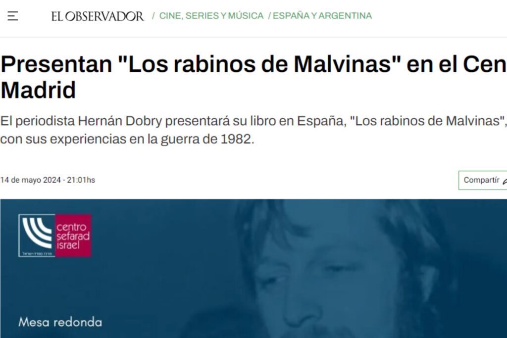 El periodista argentino Hernán Dobry presentará su libro “Los rabinos de Malvinas” el próximo lunes 20 de mayo, a las 18, en el Centro Sefarad Israel, Calle Mayor 69, en Madrid, en un evento organizado por la Fundación Archivo Rafael Cansinos Assens.
