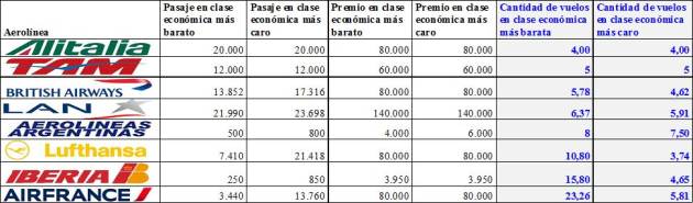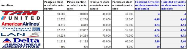 En cambio, con United Airlines necesitará 4,48 recorridos completos; con American Airlines, 4,54; con Continental Airlines, 4,56; con la chilena LAN, 4,92; con Delta Airlines, 5,40; y con Aerolíneas Argentinas, 10.