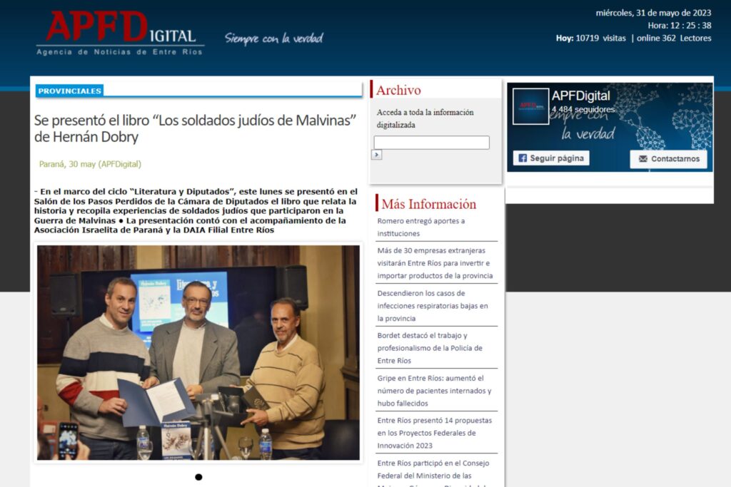 En el marco del ciclo “Literatura y Diputados”, este lunes se presentó en el Salón de los Pasos Perdidos de la Cámara de Diputados el libro que relata la historia y recopila experiencias de soldados judíos que participaron en la Guerra de Malvinas La presentación contó con el acompañamiento de la Asociación Israelita de Paraná y la DAIA Filial Entre Ríos.